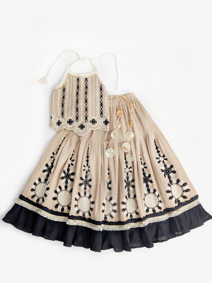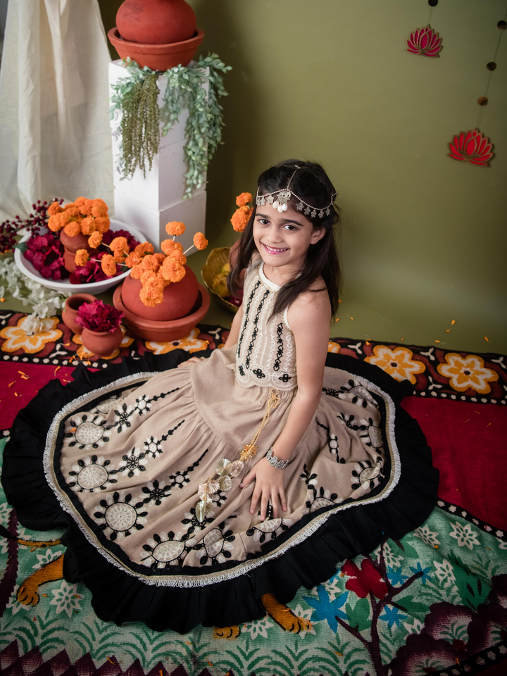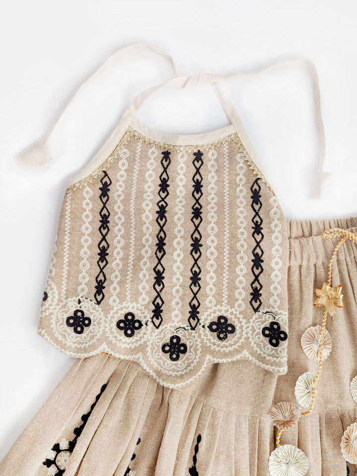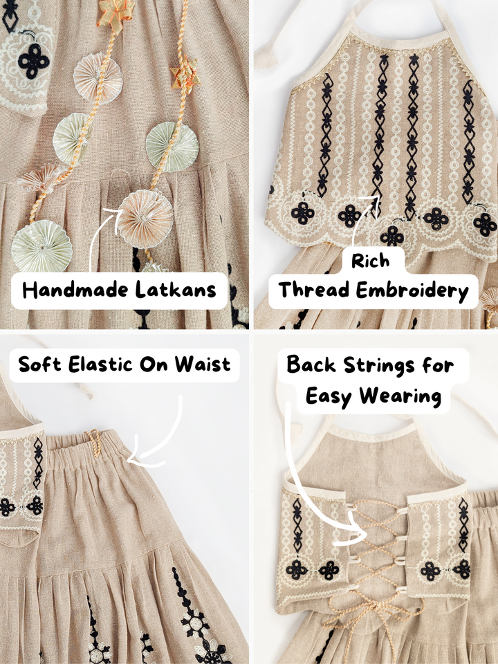 The Chikoo Tara Lehenga Choli Set is designed to bring traditional elegance with a modern touch for your little girl. The halter-neck choli in a soothing chikoo brown shade features delicate embroidery and scalloped edges, adding festive charm. The flared jute-based lehenga carries an earthy richness, highlighted with lace borders and playful tassel latkan perfect for twirling at celebrations. A unique blend of tradition, comfort, and style, this lehenga choli makes every occasion extra special.