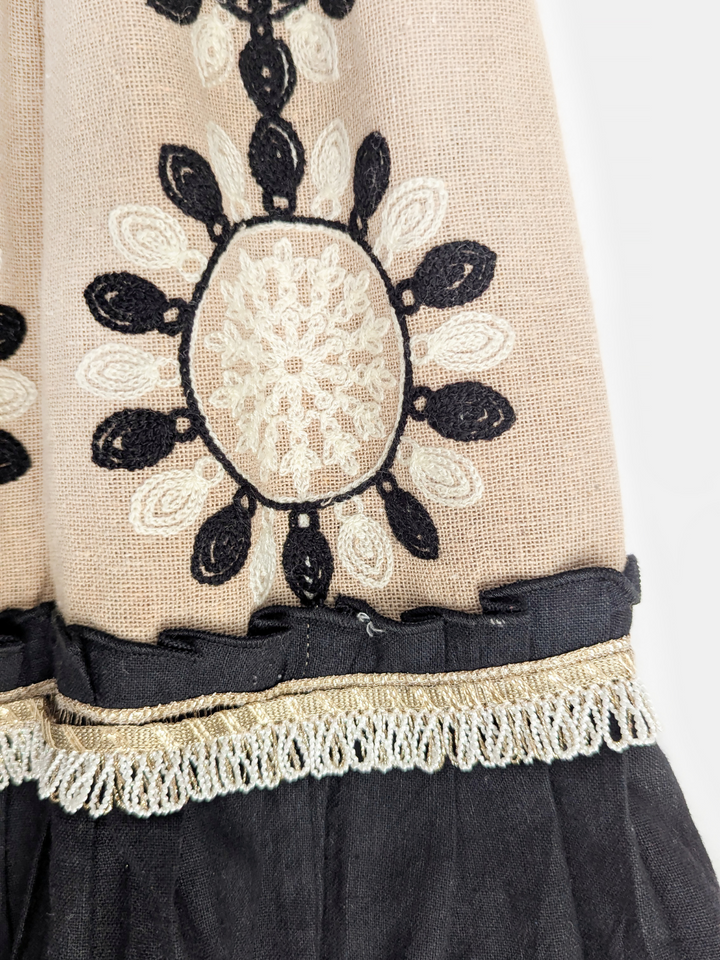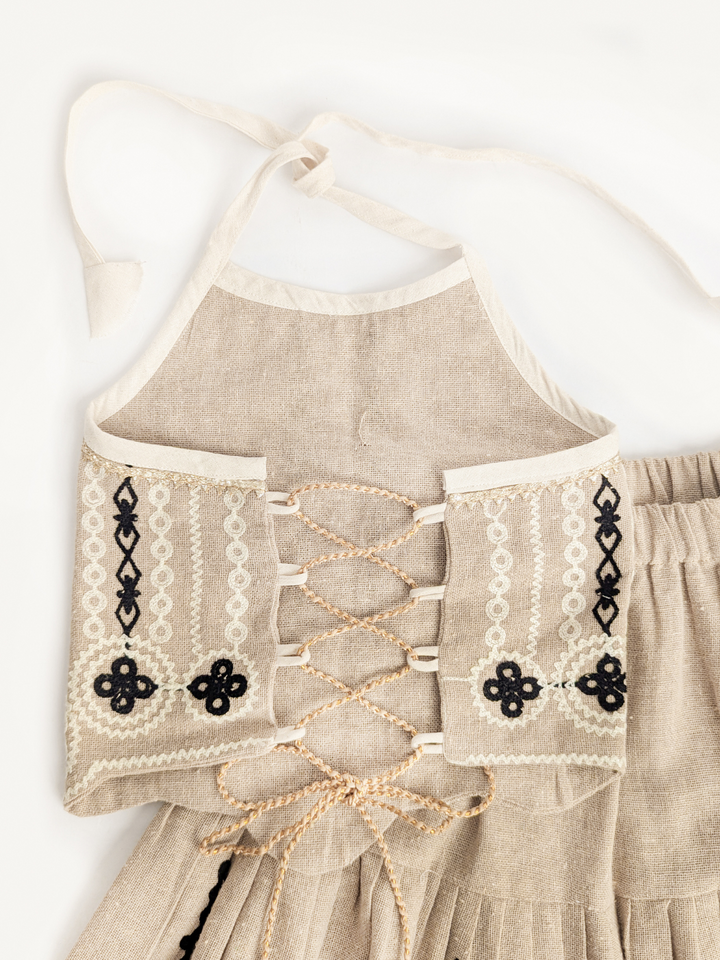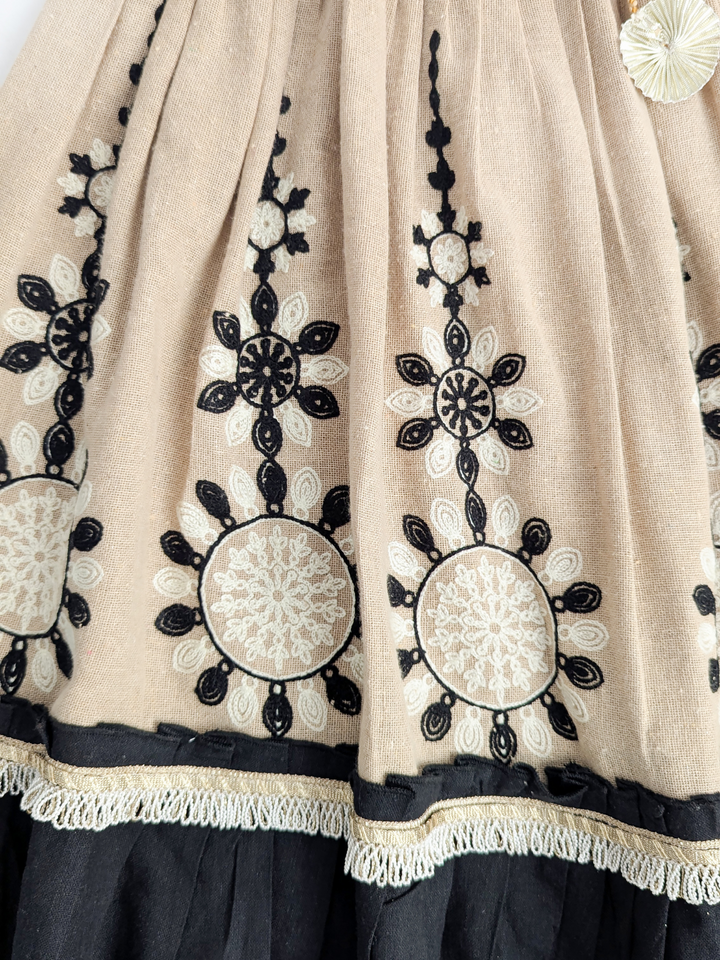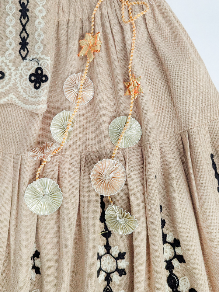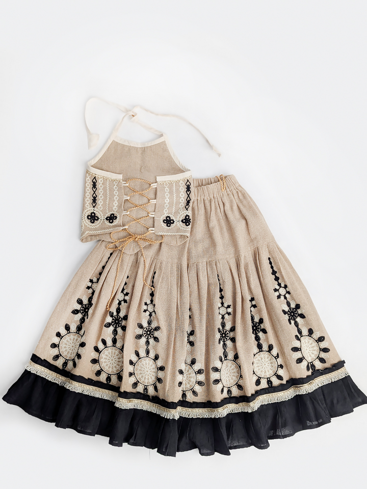 The Chikoo Tara Lehenga Choli Set is designed to bring traditional elegance with a modern touch for your little girl. The halter-neck choli in a soothing chikoo brown shade features delicate embroidery and scalloped edges, adding festive charm. The flared jute-based lehenga carries an earthy richness, highlighted with lace borders and playful tassel latkan perfect for twirling at celebrations. A unique blend of tradition, comfort, and style, this lehenga choli makes every occasion extra special.