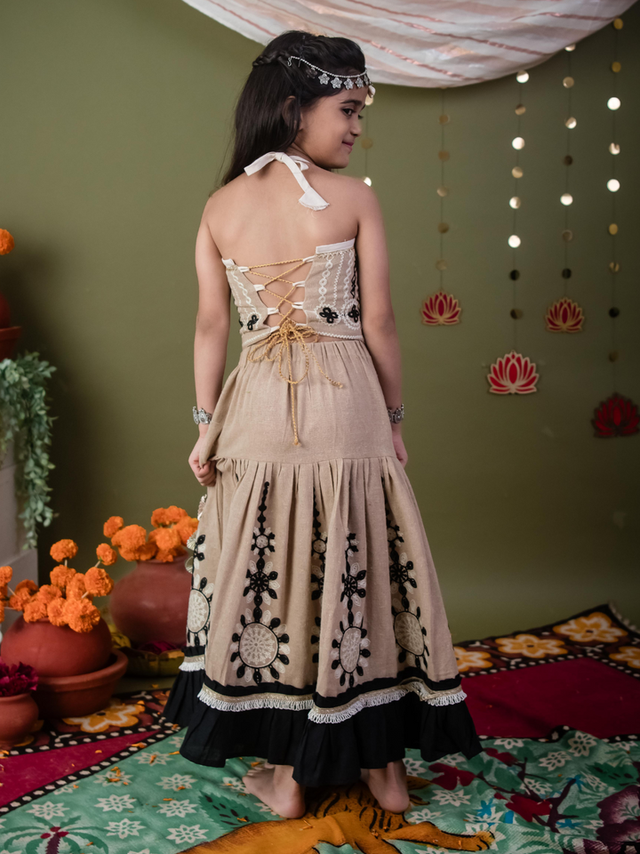 Graceful, earthy & festive!The Chikoo Tara Lehenga Choli Set is designed to bring traditional elegance with a modern touch for your little girl. The halter-neck...