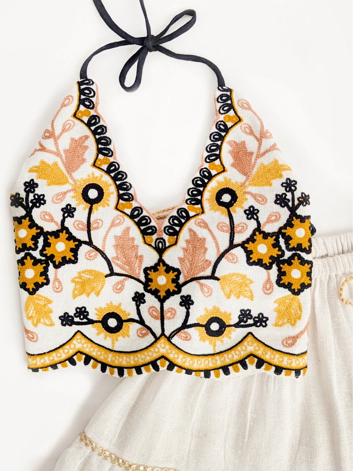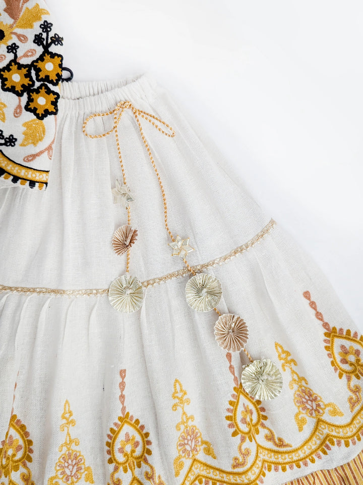 The Halemons Suvarna Mustard Jute Embroidered Chaniya Choli Set blends earthy charm with festive grandeur. The halter-neck blouse, crafted in pure jute, showcases delicate embroidery in golden and mustard hues with scalloped edges for a royal look. The flared mustard jute lehenga features intricate floral embroidery and a contrast frill border, adding a playful, twirl-worthy effect. Tassel latkans complete the outfit, making it perfect for festive moments and celebrations.